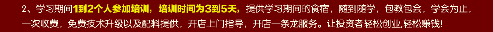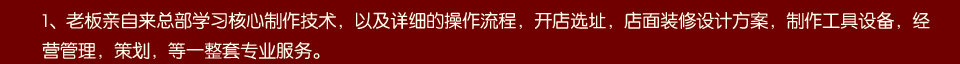 免費提供全套制作工藝及專用配方,提供鏟子、勺子,店面設計圖案,贈送:鹵味、熟食、涼菜技術資料一份,開店資格證書,授權證書,服裝2套,帽子,圍裙。(免費提供住宿)