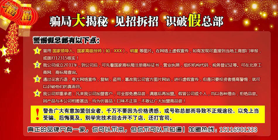專用設備一臺、開業(yè)資格證書、服裝兩件、店招光盤一張、POP吊旗、授權牌一塊、宣傳海報、開業(yè)指導方案、產品升級服務、個性化跟蹤服務、市場督導、店面設計。 (免費食宿,免加盟費)